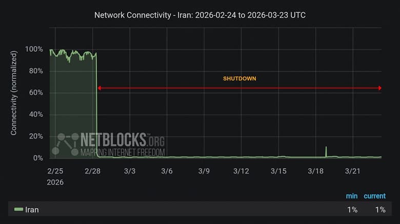 Согласно отчетам организации, страна вступила в 24-е сутки тотального сетевого блэкаута. Специалисты NetBlocks подтверждают, что суммарное время отсутствия доступа к глобальной сети превысило отметку в 552 часа.