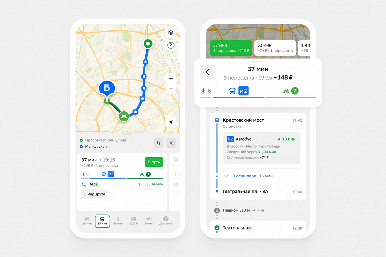 Функция охватывает свыше 100 российских городов и учитывает различные виды транспорта — автобусы, троллейбусы, трамваи, маршрутки и метро. Для жителей Москвы доступна информация по МЦК и МЦД. Возможность актуальна для большинства маршрутов.