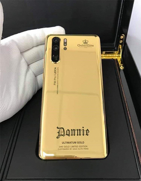 Компания Gold Elite Paris создала специальную версию флагмана Huawei P30 Pro, покрытую золотом 999-й пробы. Дорогущий смартфон подарили китайскому актеру Донни Йену и даже сделали именную гравировку Donnie на задней крышке аппарата.