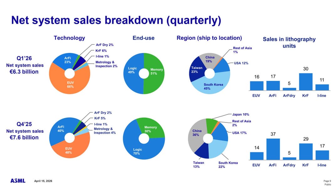 Если еще в конце 2025 года выручка компании на 70% формировалась за счет поставок оборудования для выпуска логических микросхем, а на долю решений для производства памяти приходилось лишь 30%, то уже в первом квартале 2026 года пропорция кардинально изменилась, достигнув 49% и 51% соответственно.