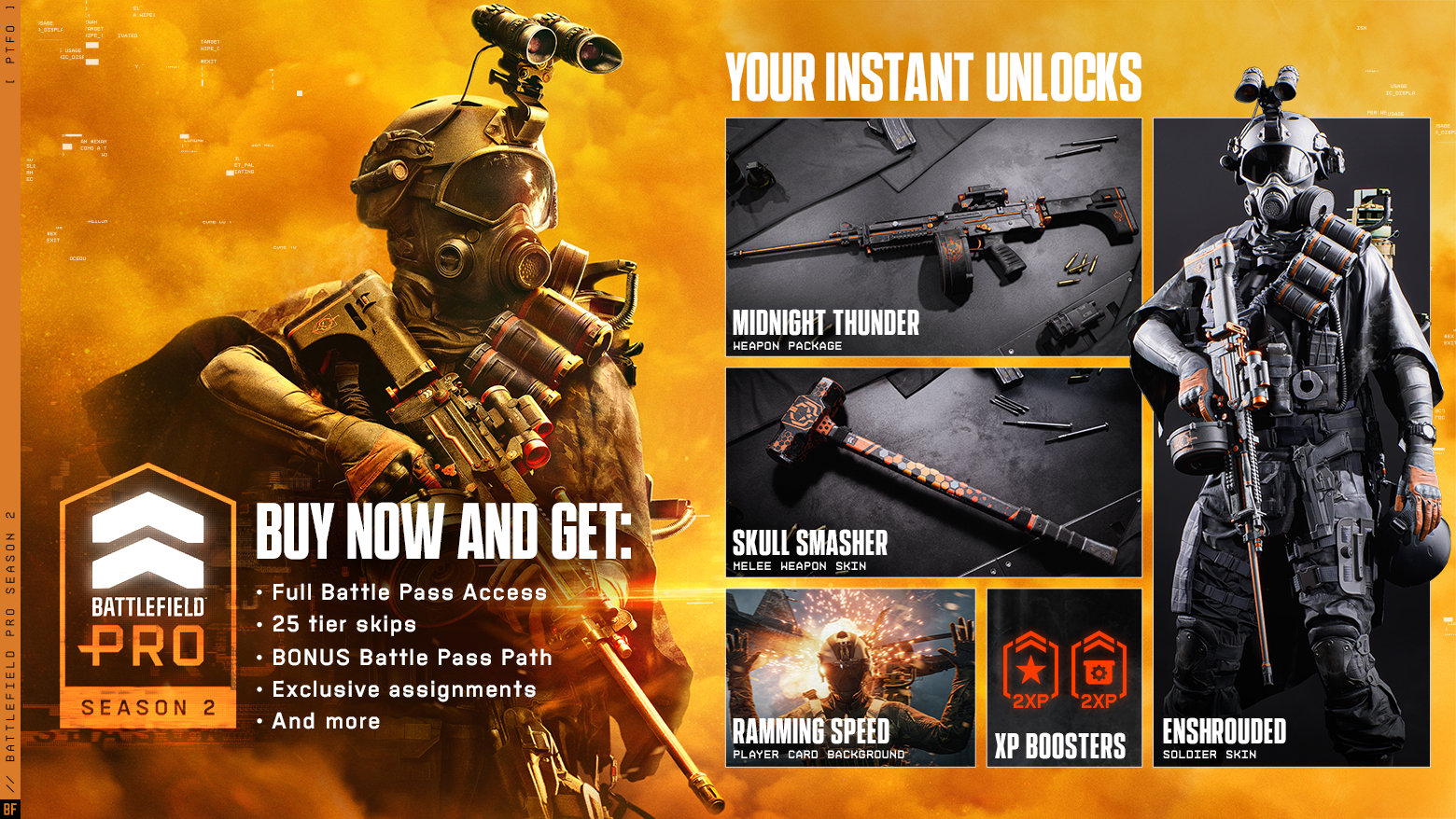 Опередите противника вместе с Battlefield Pro. Получите 6 мгновенных бонусов BF Pro, пропуск 25 этапов и доступ к эксклюзивному бонусному пути с тактическим снаряжением, созданным для усиления вашего арсенала. Будьте готовы к решительным действиям.