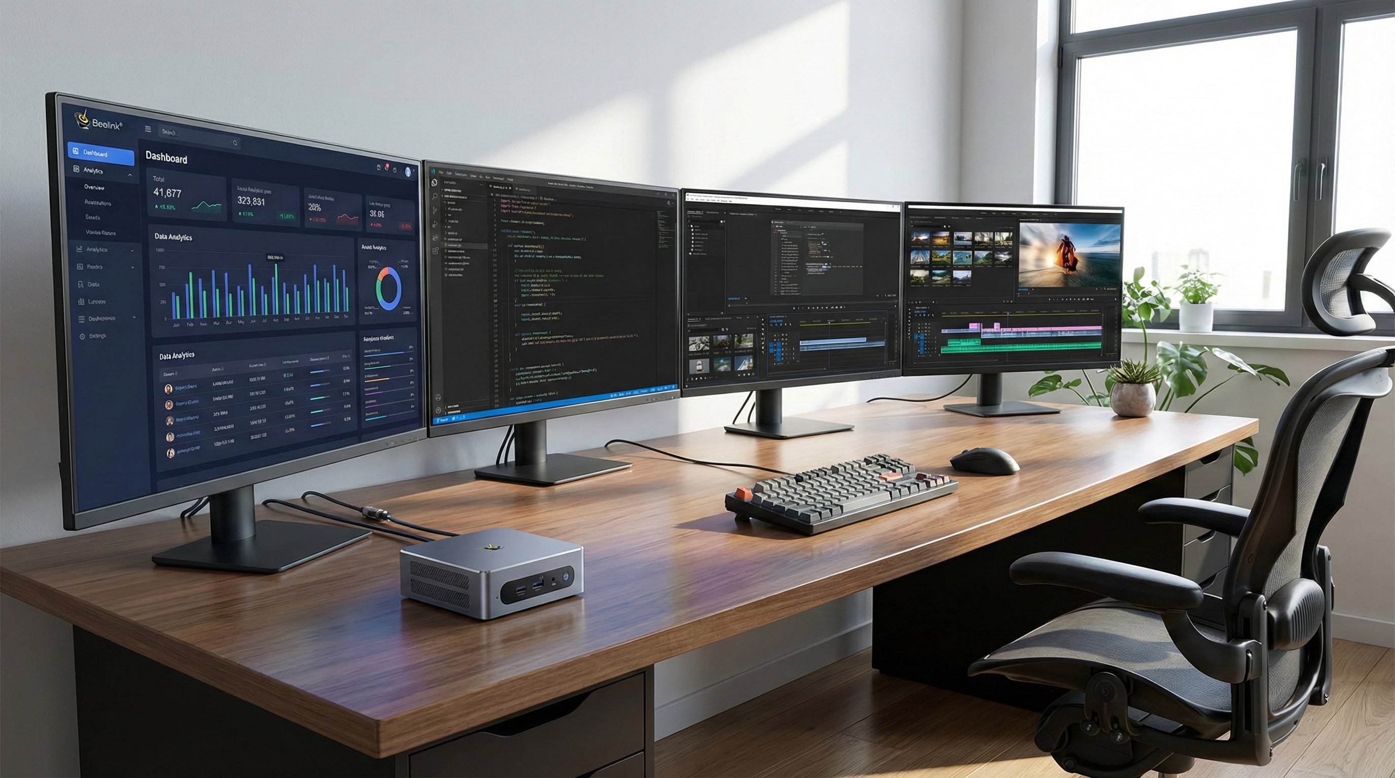 Два порта LAN 10GbE обеспечивают сверхбыстрое сетевое соединение. Два порта USB4 (40 Гбит/с) позволяют подключать высокоскоростные периферийные устройства и внешние дисплеи. Мини-ПК способен поддерживать до четырëх дисплеев 8K, благодаря наличию HDMI 2.1, DisplayPort 2.1 и двум портам USB4 (40 Гбит/с/8K @ 60 Гц). Это делает его идеальным выбором для профессионалов, работающих с графикой, видеомонтажом и другими ресурсоемкими задачами.