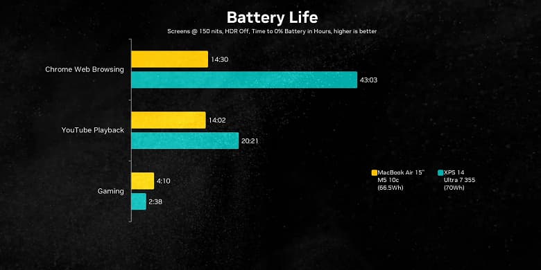 В ходе испытаний при веб-серфинге через браузер Chrome и яркости экрана 150 кд/м² лэптоп продемонстрировал феноменальный результат — 43 часа работы без подзарядки. Для сравнения, MacBook Air 15 на базе чипа M5 в аналогичном режиме смог продержаться лишь 14,5 часа.