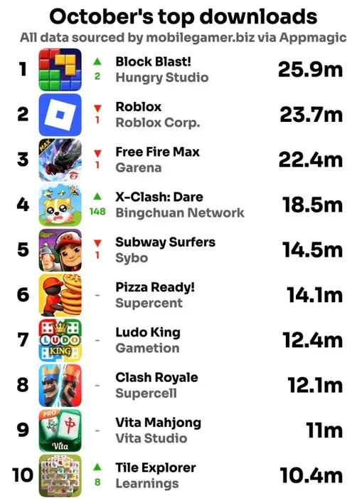Analysts have tallied mobile game downloads for October 2025 and produced a ranking of the month’s most-downloaded titles.