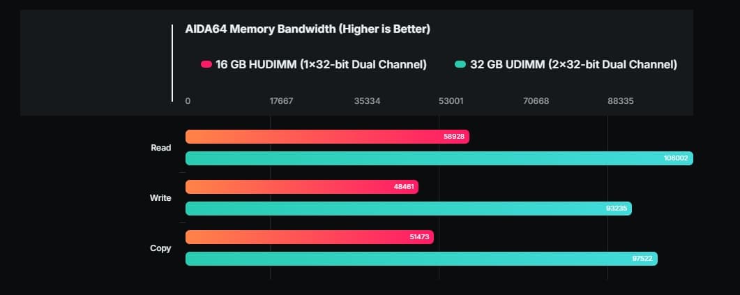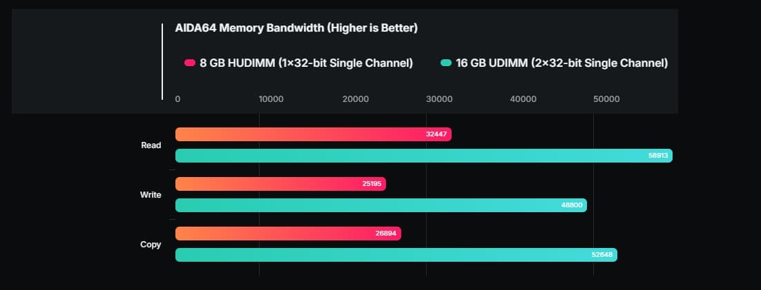 Первые испытания бюджетного стандарта памяти HUDIMM подтвердили закономерные опасения: новая архитектура демонстрирует существенное отставание от стандартных модулей. Результаты замеров свидетельствуют о снижении пропускной способности практически в два раза.