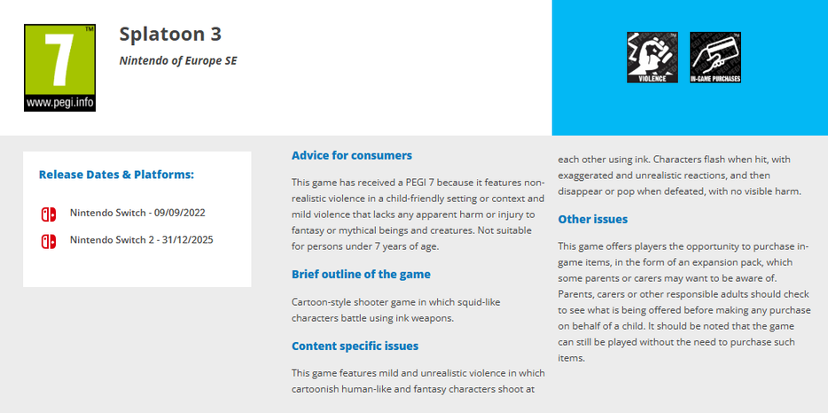 The Pan European Game Information (PEGI) ratings board has officially issued an age rating for the Nintendo Switch 2 version of Splatoon 3.