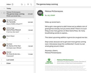 Команда маркетинга Xbox вновь задействовала образ Мелиссы МакГеймпасс — персонажа, который традиционно используется для скрытых анонсов новых игр в каталоге. Совсем недавно именно через неё подтвердились слухи о выходе в подписке Avatar: Frontiers of Pandora и Kingdom Come: Deliverance II, что лишь подтверждает достоверность подобных тизеров.