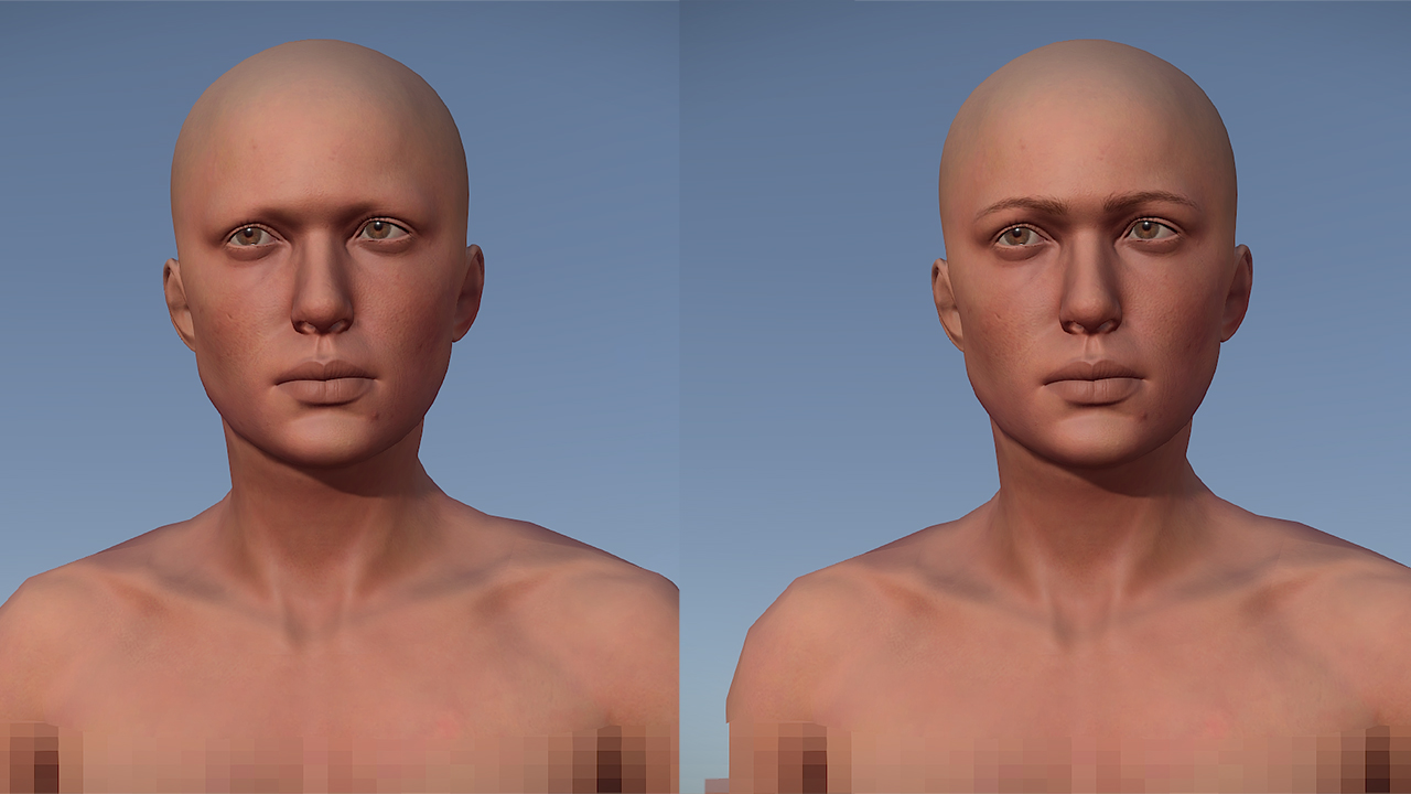 Я надеялся добавить брови вместе с остальным волосяным покровом, но лица без бровей выглядели несколько, эм… странно, и я таки решил сперва сделать их, включая разные расовые вариации. Просто взгляните, какие заметные изменения вносят обычные брови!