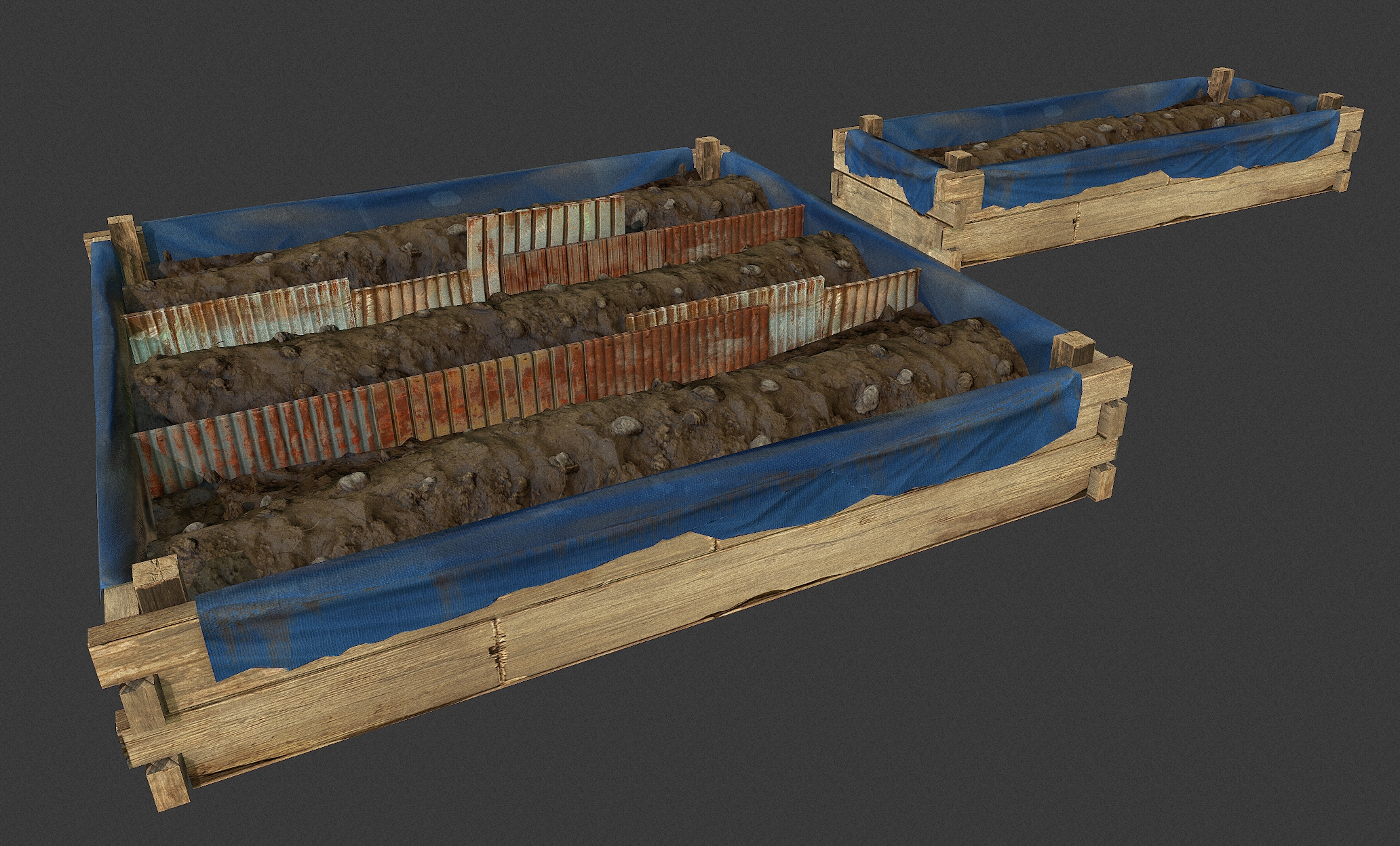 Я создал грядки, основываясь на концептах Howie. Как предполагает картинка, будет два типа грядок: 3х3 метра, которая прекрасно уместится на фундаменте и 3х1 метр. Мне ещё нужно поработать над LOD`ами, но в целом получилось неплохо!