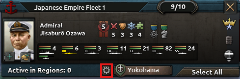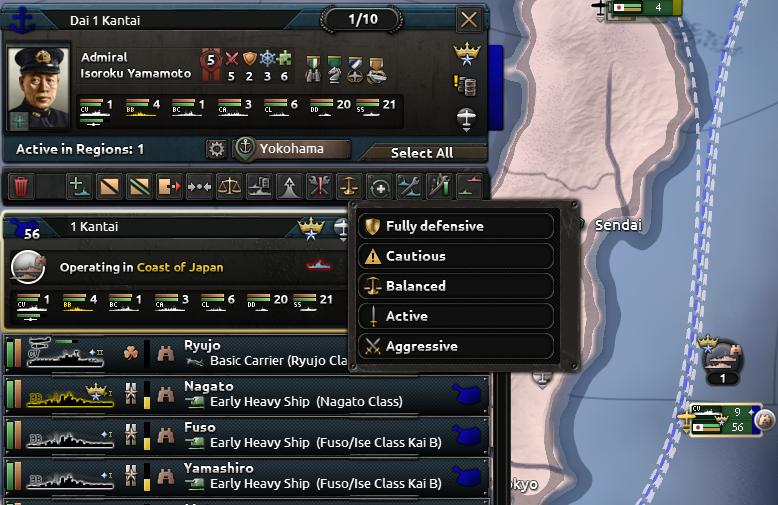 Позиции авианосцев позволяют тонко настроить поведение task force с авианосцами: какой процент самолётов держать в резерве для защиты флота и какой направить на наступательные операции. Хочете рискнуть и максимально атаковать при первой возможности — переключитесь в агрессивный режим, но тогда будьте готовы к неожиданному появлению вражеских авианосцев.