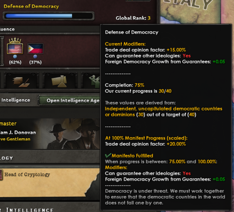 Манифесты фракций теперь дают масштабируемые бонусы в зависимости от уровня их исполнения. При достижении определённого порога вы будете получать дополнительные бонусы — например, гарантия безопасности другим странам может давать дрейф демократии в гарантируемых государствах.