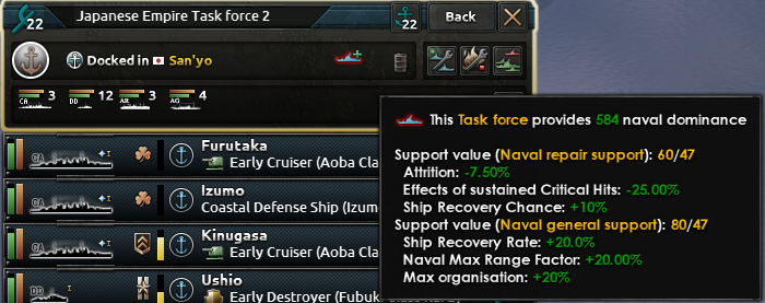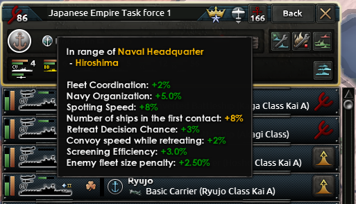 Пример зоны действия Naval Headquarters в Хиросиме и визуализация покрываемых task force бонусов.
