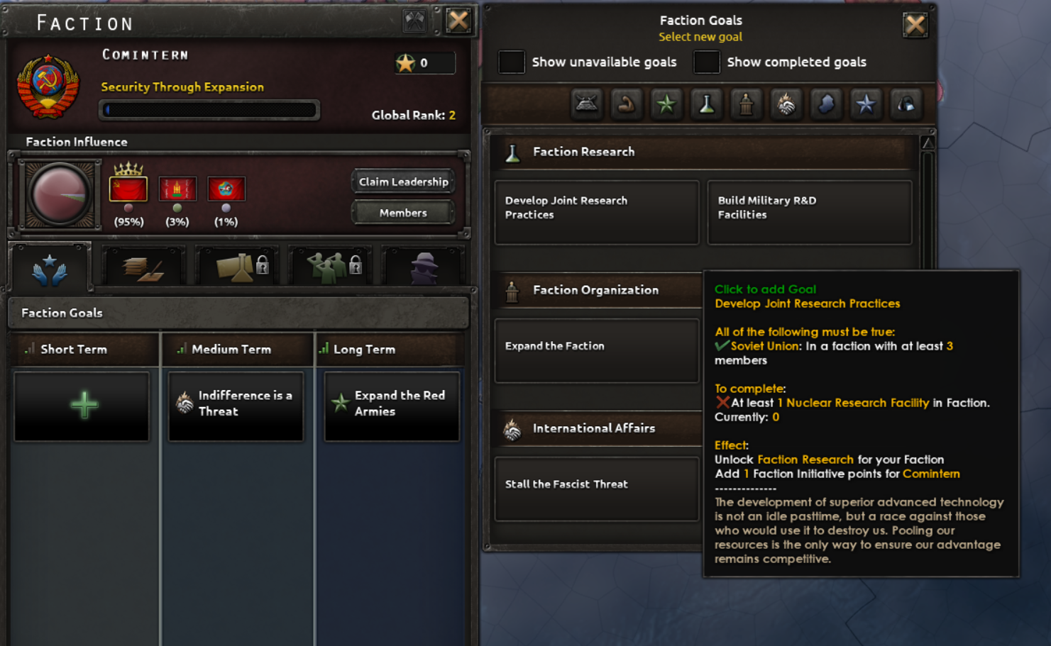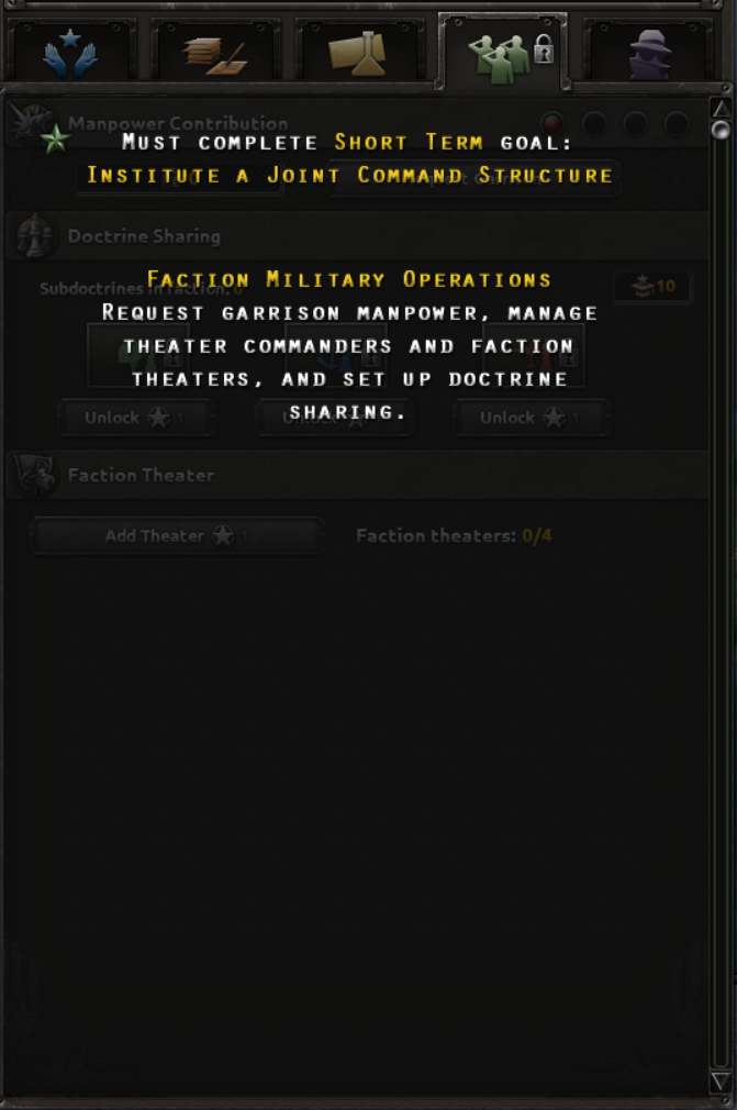 Следующая вкладка — Военные операции фракции — по похожему принципу разблокируется выполнением цели «Установить совместную командную структуру». Эта цель направлена на создание объединённых штабов союзников и повышение координации между армиями разных стран — представьте себе Совместные штабы или SHAEF.