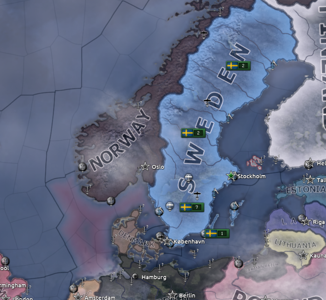 На скриншоте Германия успешно блокирует Швецию — красная заливка показывает регионы, где немцами накоплено морское доминирование. Отправка флота для восстановления контроля над Восточным Северным морем снимет блокаду и возобновит морскую торговлю.