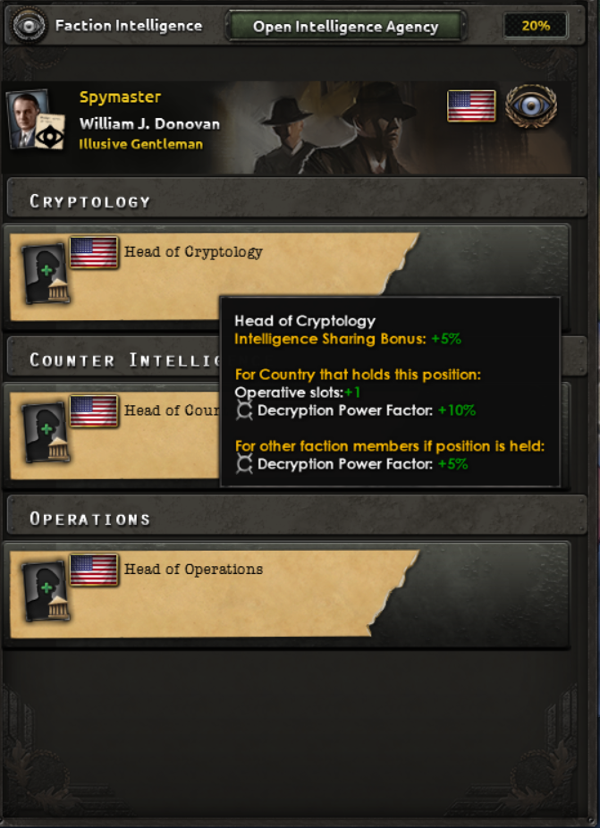Помимо шефа разведки (Spymaster), теперь в фракции доступны ещё три роли: глава криптологии, контрразведки и операций. Назначение советника на одну из этих позиций приносит выгоду и его стране, и всем членам фракции. Как и прочие позиции, каждую из них необходимо разблокировать за инициативы фракции.
