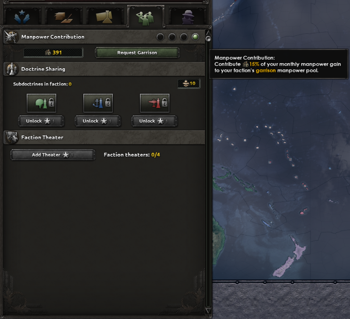 Игроки могут выбрать один из четырёх уровней месячного взноса в общий пул людских ресурсов — от 0% до 15% от прироста в месяц. Эти вклады аккумулируются в общем пуле гарнизонного резерва фракции, из которого могут черпать все члены фракции.