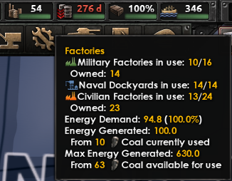 Новый тултип сверху показывает общее потребление энергии вашей промышленностью (и процент обеспеченности), текущую выработку энергии и ресурсы, используемые для этого, а также теоретический максимум с имеющимися у вас ресурсами.