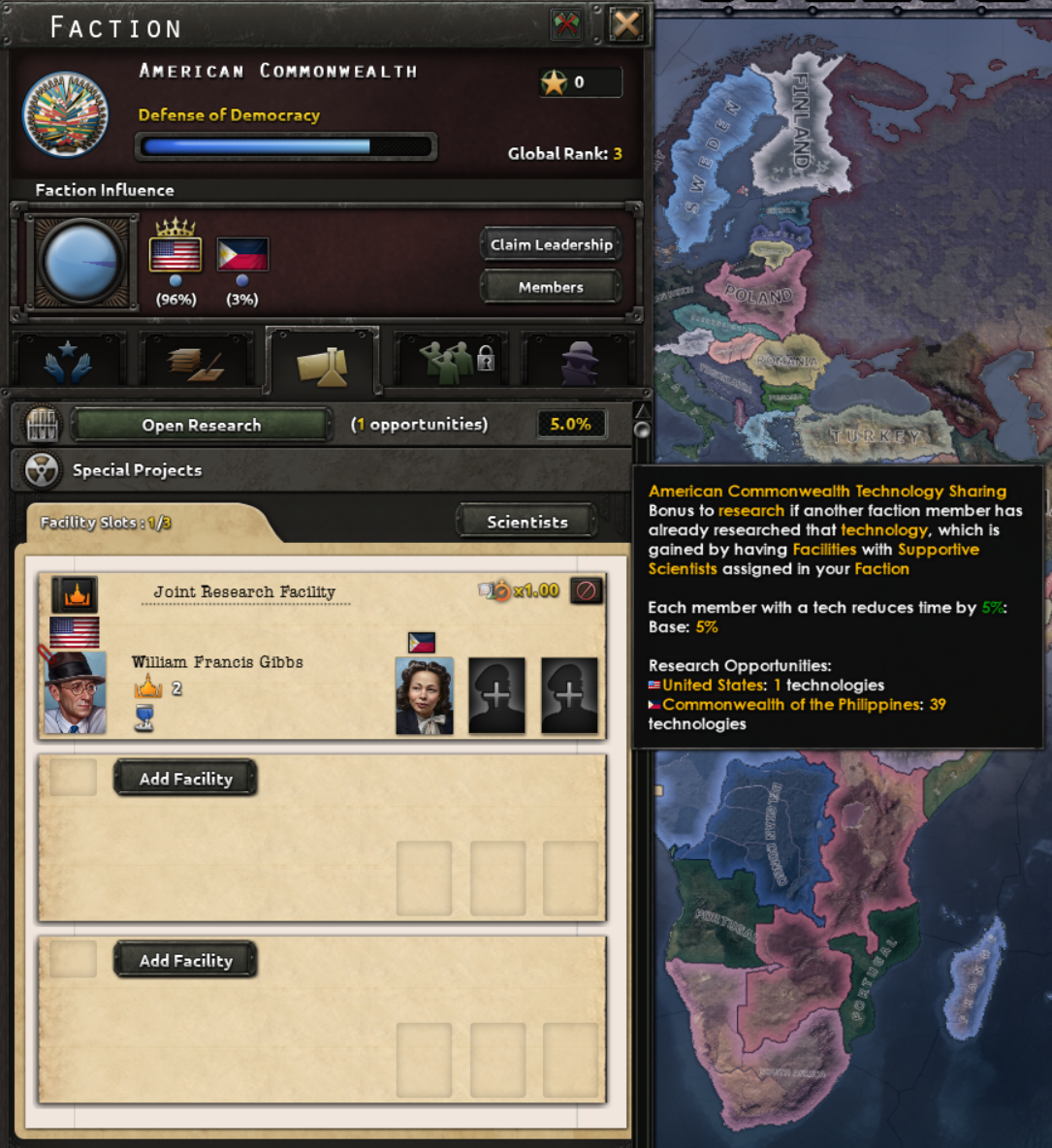 Пример: США сделали свой морской экспериментальный центр в Мэриленде объединённой исследовательской базой, а Филиппины направили туда учёного. Теперь у американского содружества есть +5% бонуса к обмену исследованиями, а специальные проекты в этой базе будут развиваться быстрее, причём Филиппины получат часть прогресса.