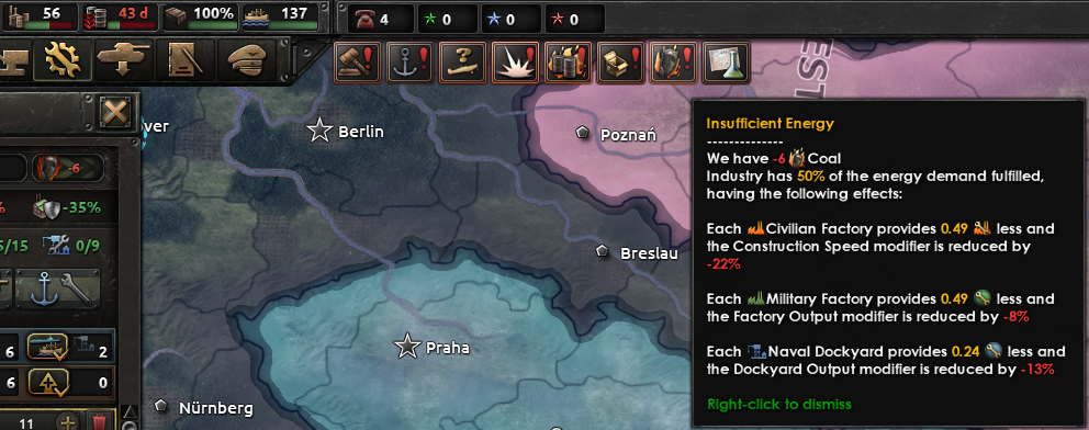 Появилось оповещение, показывающее, сколько угля вам нужно для удовлетворения потребностей промышленности и какие отрицательные эффекты действуют при дефиците.