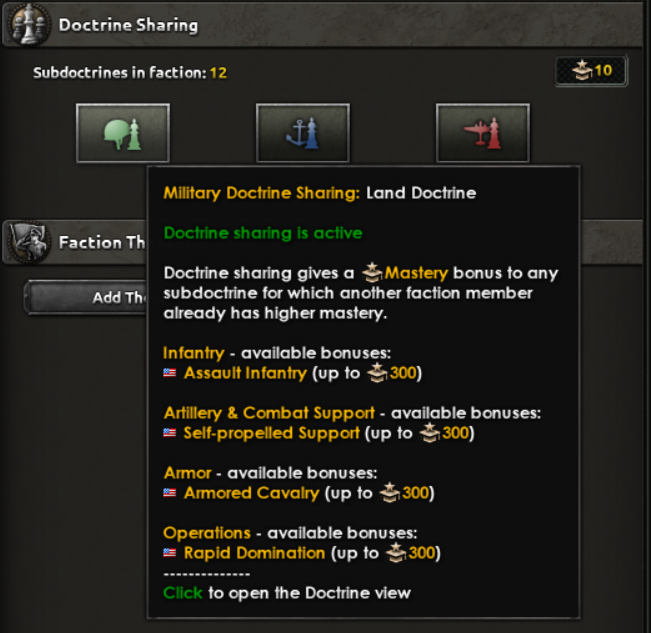 Ещё одна форма кооперации — разблокировка обмена доктринами. За инициативы можно открыть обмен в одной категории (сухопутная, военно‑морская, военно‑воздушная). Если у страны‑донорa выбран те же поддоктрины и её уровень боевых способностей выше, она будет делиться прогрессом с теми, кто отстаёт.