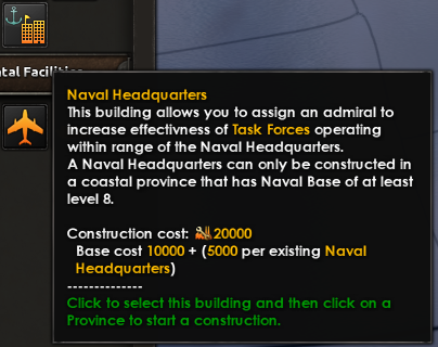 Вы помните, как увеличение лимита морских баз на отдельных островах сделало их более значимыми? Познакомьтесь с двумя новыми постройками: Naval Supply Hub и Naval Headquarters. Оба требуют наличия морской базы уровня 8 в провинции, поэтому их можно размещать только в развитых портах — это усиливает стратегическую ценность крупных гаваней.