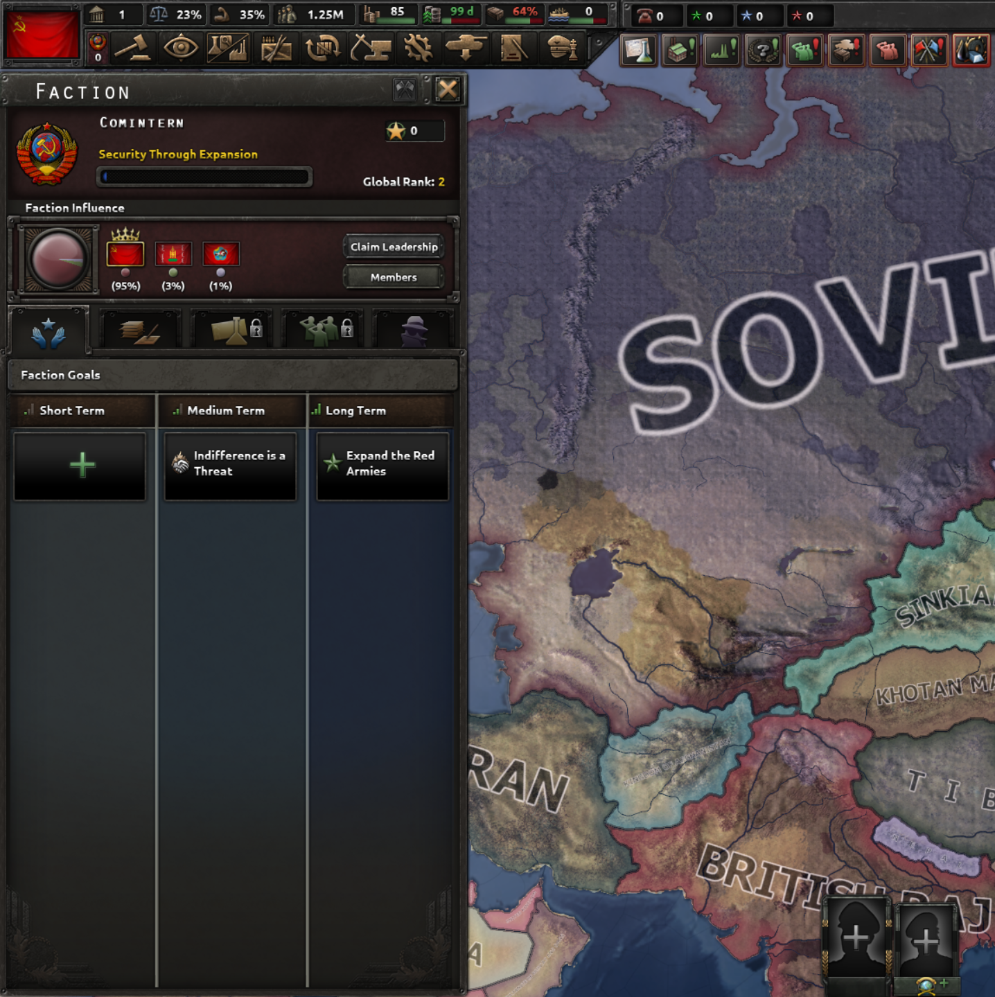 Обновлённое окно фракции. Теперь на верхней панели между флагом страны и вкладкой решений появился новый элемент — быстрый доступ к окну фракции. Внимательные заметят логотип фракции; число под ним показывает, сколько у вас инициатив фракции. Новая иконка справа с двумя флагами и восклицательным знаком сигнализирует о возможности выбрать новую цель фракции — она находится в разделе «Краткосрочные цели фракции».