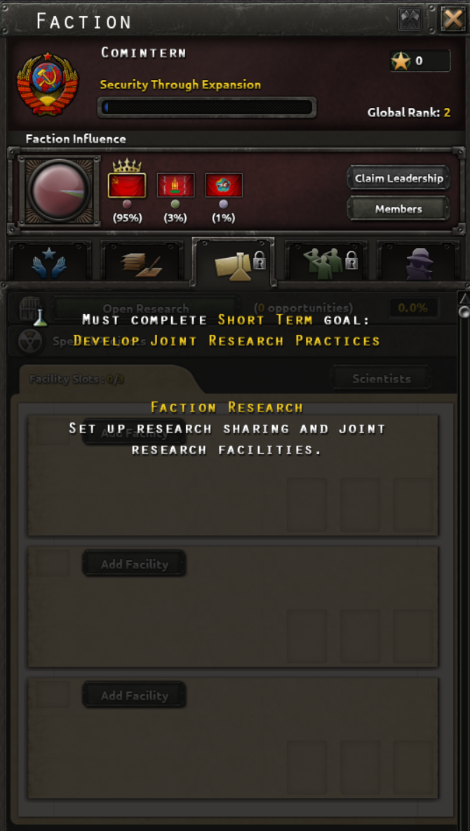 Когда вкладка разблокирована, вы можете потратить инициативы фракции, чтобы превратить одну из своих экспериментальных баз в Объединённую исследовательскую станцию. Другие члены фракции смогут направлять туда собственных учёных, тем самым увеличивая бонус к фракционному исследованию и ускоряя работу над специальными проектами, развиваемыми на этой базе.