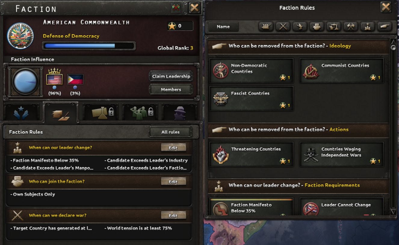Термины «Идеологические правила» или «Правила вступления» заменены более наглядными и описательными формулировками, чтобы с первого взгляда было понятно, о чём речь — например: «Кого можно исключить из фракции?». Некоторые правила теперь могут иметь прикреплённые модификаторы и влиять на игровой процесс — например, менять стоимость мирных операций в мирной конференции, делая, скажем, сундукам Коминтерна выгоднее устанавливать марионеточные режимы.