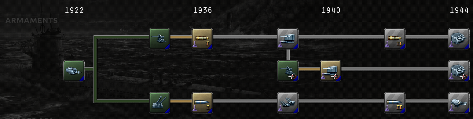 По отзывам дерево морских технологий казалось перегруженным и тяжело читаемым, поэтому мы провели его оптимизацию. На скриншоте показан пример упрощённой ветки артиллерии кораблей; по всему дереву есть небольшие правки.