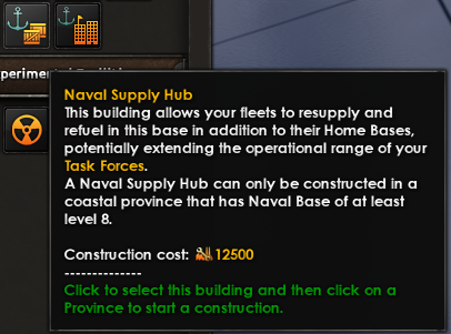 Иконка и описание Naval Supply Hub. Не беспокойтесь: обычная логистика в порты остаётся в силе — ничто не мешает поставлять снабжение традиционными способами.