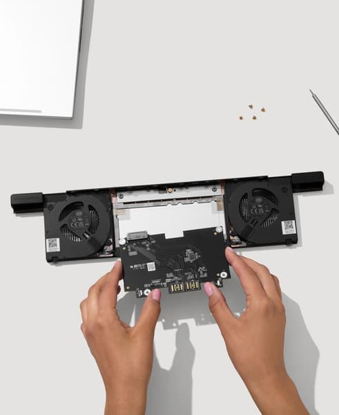 Разработчики присвоили порту название OCuLink 8i. Данный модуль является эксклюзивным дополнением исключительно для модели Laptop 16. Комплект поставки включает не только сам коннектор, но и компактную док-станцию для видеокарты — таким образом, владельцу остается лишь добавить графический адаптер и обеспечить его питанием.