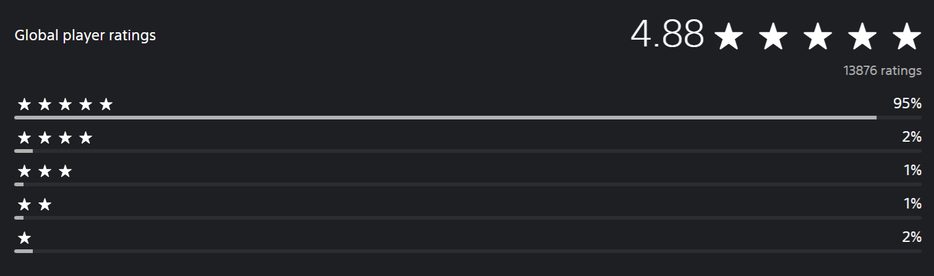 На старте в PS Store средний рейтинг Ghost of Yotei составил 4.88 из 5. Всего проголосовало почти 14 тысяч человек — большинство оценок приходится на «пять звёзд», тогда как «четыре» и «две» занимают по 2% каждая.