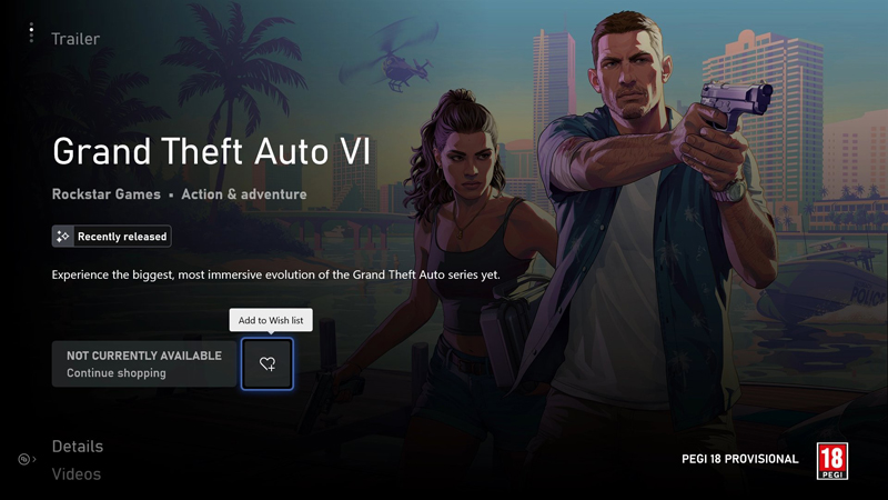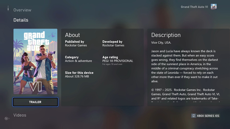 Есть и еще одна особенность: помимо возможности добавить игру в список желаемого, Xbox позволяет «скачать» GTA VI. Файл весит 328,76 МБ и сохранится до начала предзагрузки.