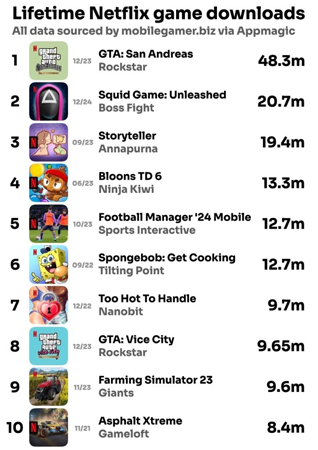 Компания не публиковала точных данных по загрузкам мобильной версии GTA: Trilogy — Definitive Edition, однако статистика среди подписчиков Netflix подтверждает высокую востребованность сборника: за первые шесть месяцев его скачали примерно 30 млн раз, а спустя год совокупное число загрузок превысило 62 млн.