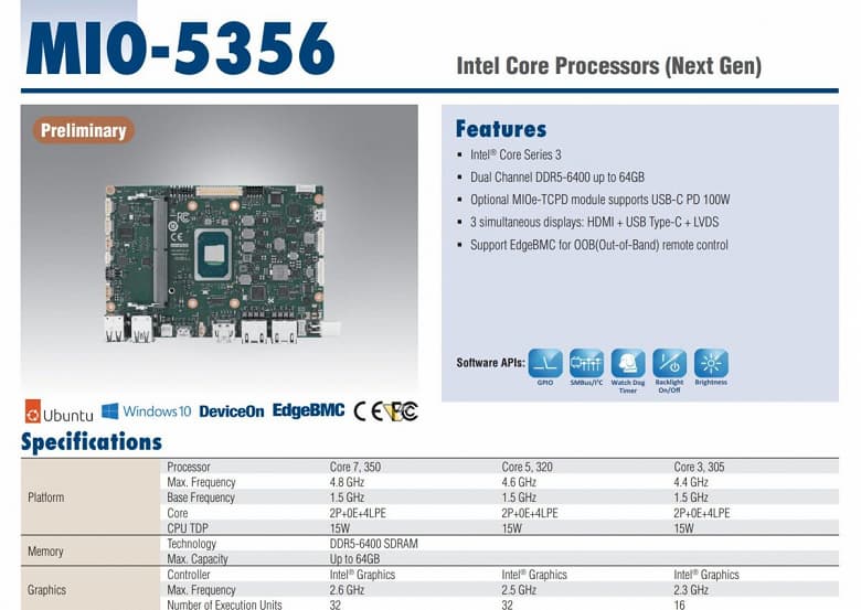 Технические параметры перспективного семейства процессоров Intel Wildcat Lake были раскрыты благодаря утечке документации OEM-партнера. По информации портала VideoCardz, компания Advantech в спецификациях к своей новой материнской плате MIO-5356 перечислила характеристики сразу трех моделей: Core 7 350, Core 5 320 и Core 3 305.