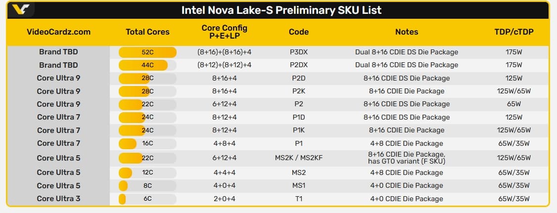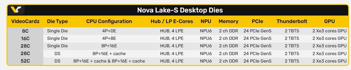 Портал Videocardz поделился эксклюзивными подробностями о грядущем семействе процессоров Intel Nova Lake-S, релиз которых намечен на конец текущего или начало следующего года. В распоряжении редакции оказались детальные спецификации кристаллов и структура модельного ряда.