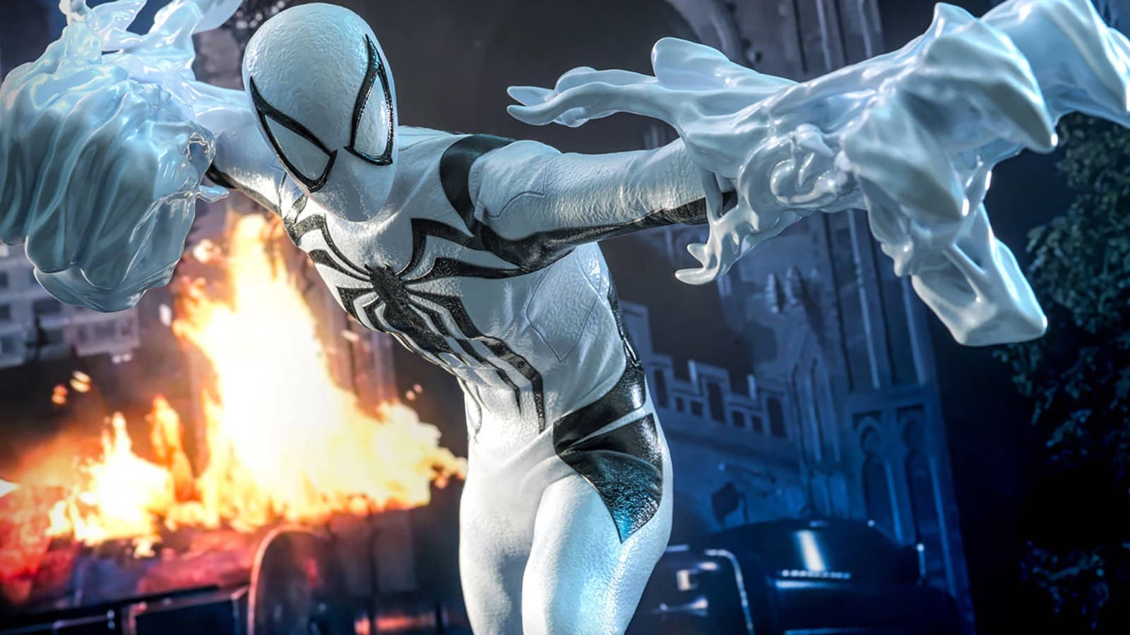 The package also includes a pearlescent white Spider-Man suit with black trim and a spider emblem on the chest, along with ten removable white symbiote pieces that attach to the back.