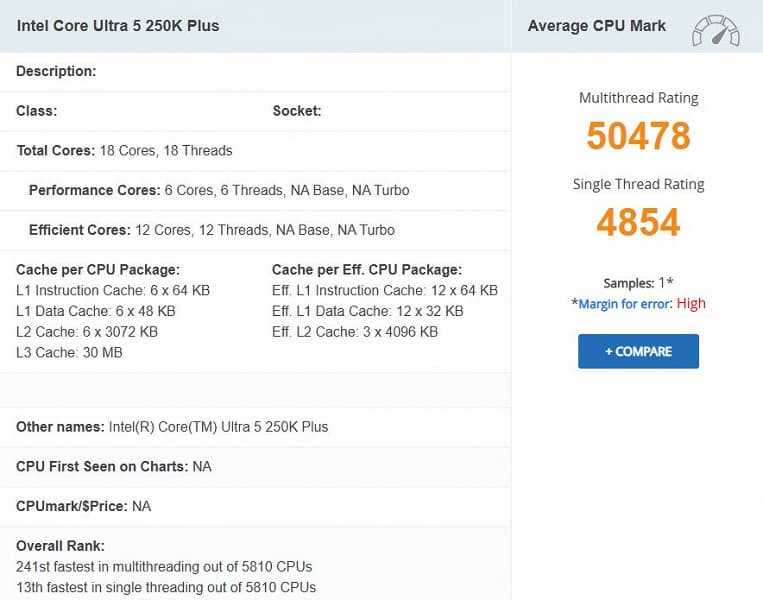 В базе данных популярного тестового пакета PassMark были обнаружены сведения о производительности грядущего процессора Intel Core Ultra 5 250K Plus. Информация о новинке просочилась в сеть всего за неделю до предполагаемого официального дебюта обновленной линейки Arrow Lake Refresh.