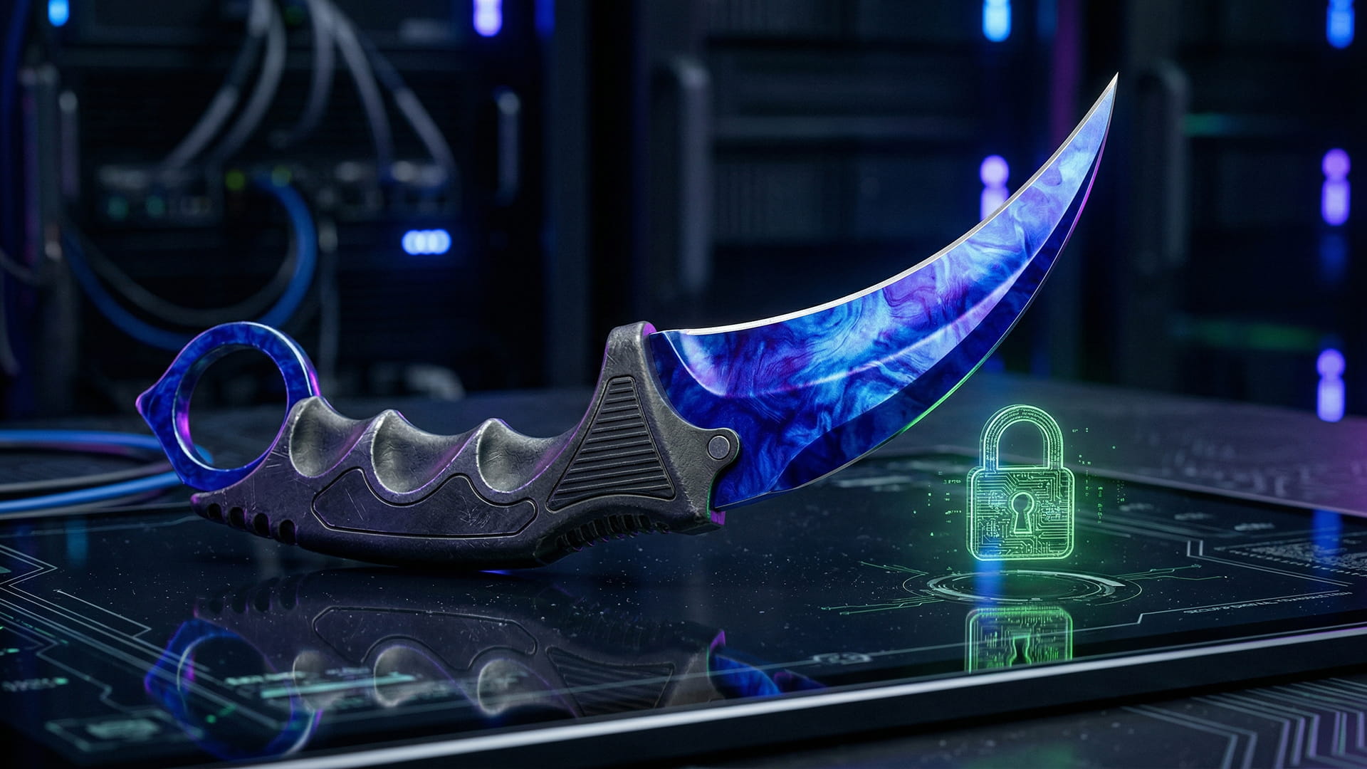 Detailed Karambit knife with a blue Doppler blade resting on a digital locking interface