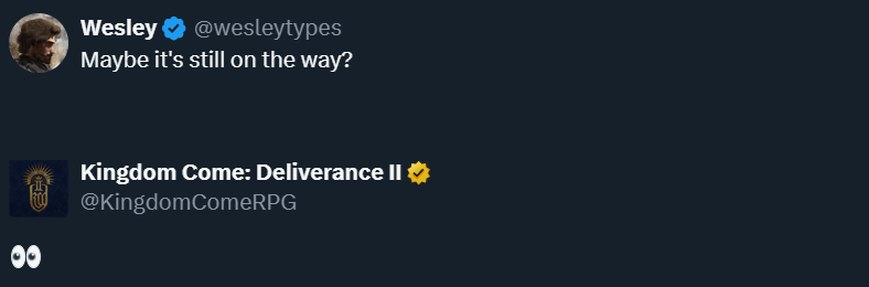 When wesleytypes asked, “Could an update be in the works?” the official Kingdom Come: Deliverance account responded to the post with a wide‑eyed emoji.