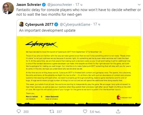 Журналист Джейсон Шрейер из Bloomberg News считает, что перенос – хорошая новость, потому что консольным игрокам не придётся задумываться о том, стоит ли ждать несколько месяцев появления консолей следующего поколения.