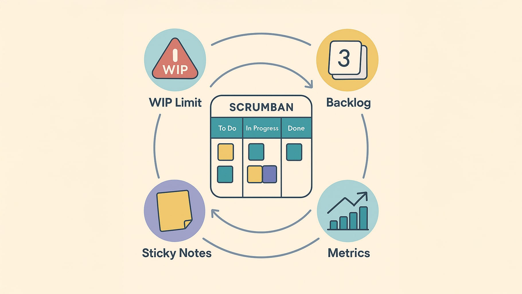 Scrumban — это гибридная методология, которая берёт из Scrum спринты, роли и ретроспективы, а из Kanban — визуализацию процесса и вытягивающую систему работы (pull‑system). Главная цель — обеспечить команде нужный уровень планирования без перегрузки ритуалами и одновременно сохранить гибкость непрерывного потока задач.