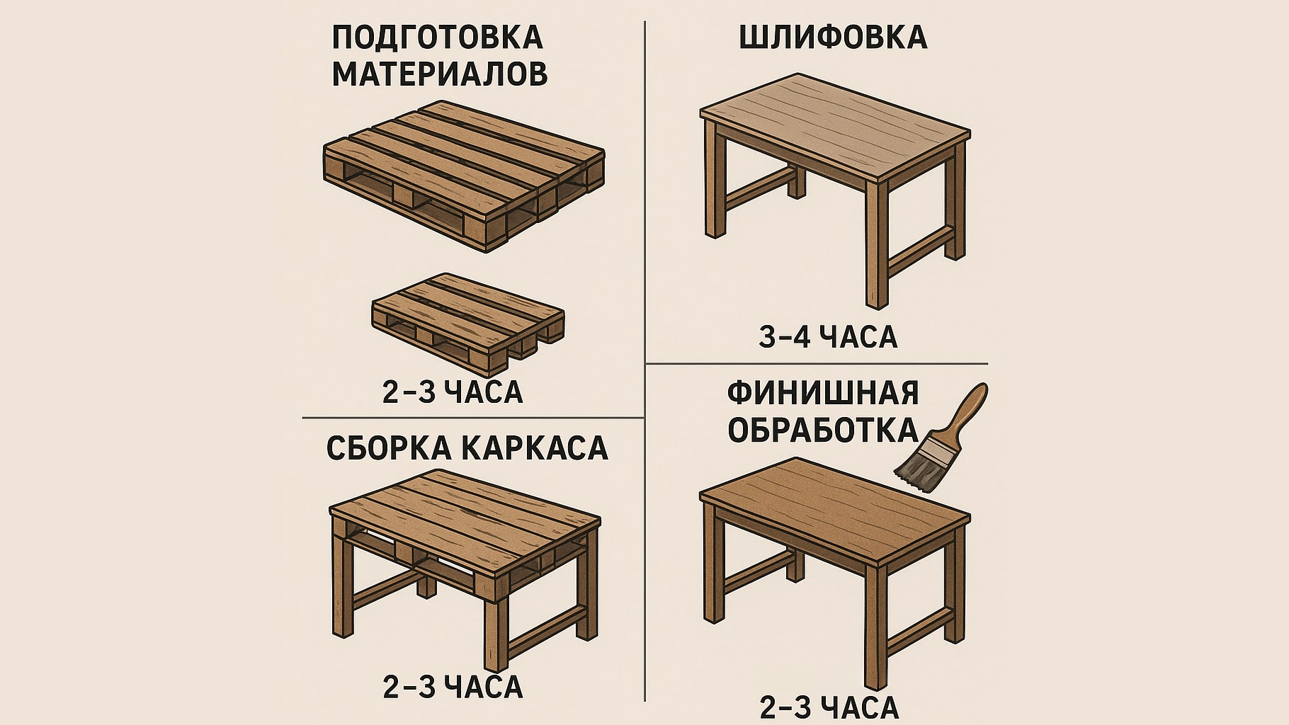Схема сборки: подготовка материалов занимает 2-3 часа, шлифовка поверхностей — 3-4 часа, сборка каркаса — 2-3 часа, финишная обработка — 2-3 часа. Общее время работы составляет 9-13 часов.