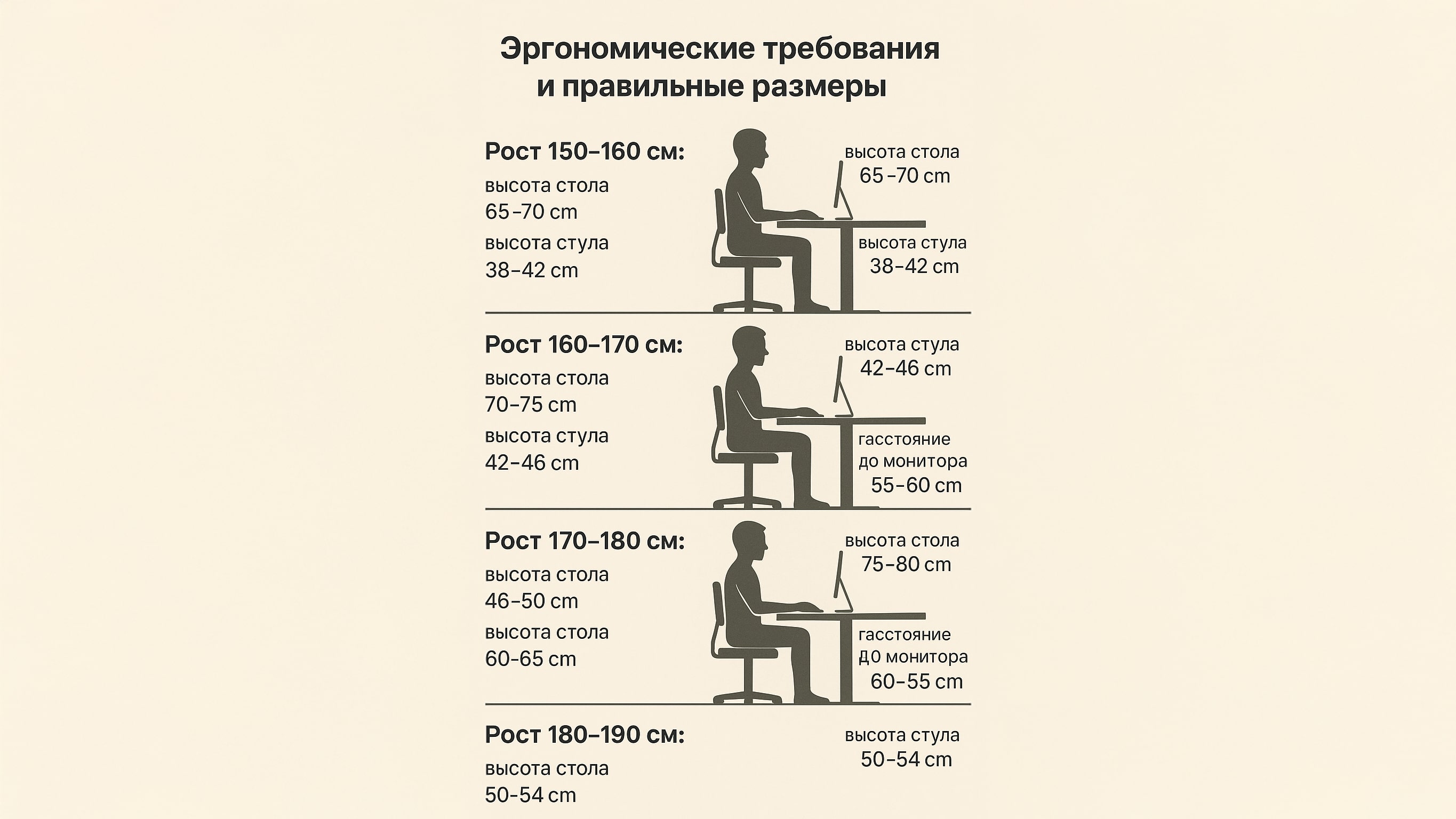 - Рост 160-170 см: высота стола 70-75 см, высота стула 42-46 см, расстояние до монитора 55-60 см