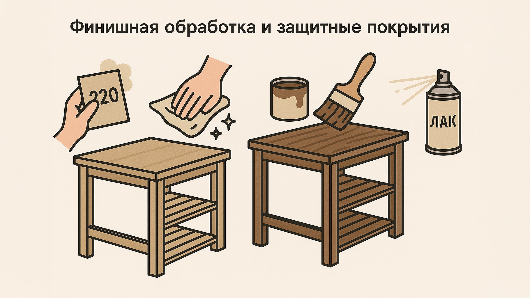 Декоративные покрытия наносятся в 2-3 слоя с промежуточной шлифовкой мелким абразивом. Каждый слой должен полностью высохнуть согласно инструкции производителя. Качественная финишная обработка не только защищает древесину, но и придаёт самодельному столу профессиональный внешний вид, неотличимый от фабричных изделий.