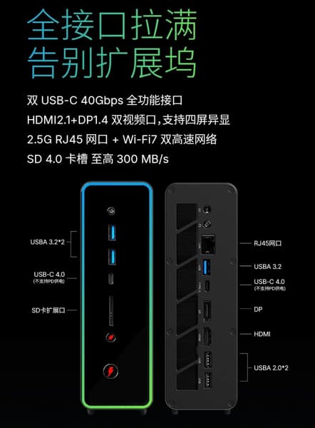 Инженерная компоновка корпуса позволяет разместить внутри сразу три твердотельных накопителя. Богатый набор интерфейсов включает поддержку Wi-Fi 7, разъем 2.5GbE, два порта USB4, видеовыходы DisplayPort и HDMI, а также полноценный набор из пяти портов USB (два версии 2.0 и три 3.2) и слот для карт памяти формата SD.