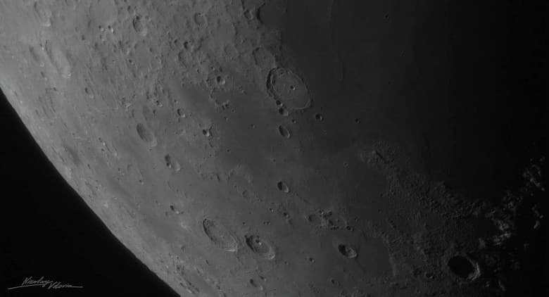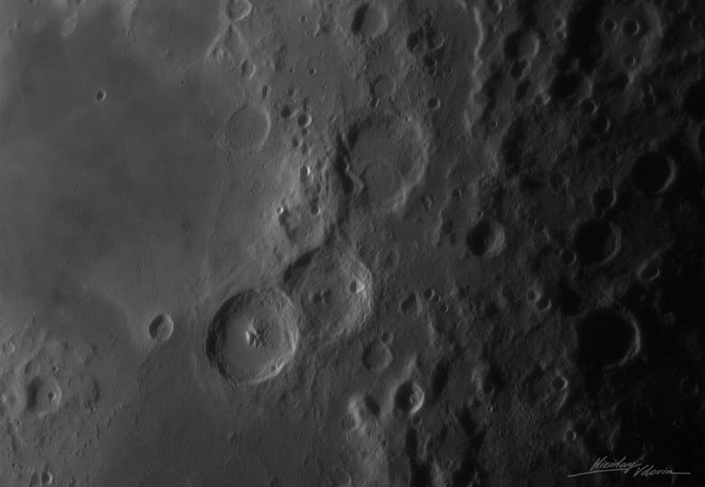 Третья фотография была сделана в районе лунного терминатора — линии, разделяющей освещенную и теневую стороны диска. Именно здесь ландшафт обретает максимальную выразительность: благодаря косопадающим солнечным лучам и глубоким теням становятся видимыми мельчайшие особенности рельефа, включая террасированные склоны кратеров, россыпи мелких углублений и характерные следы выбросов грунта.
