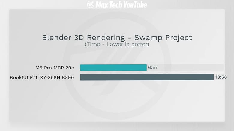 Гораздо важнее разница в чистой вычислительной мощности. Если Core Ultra X7 358H не позиционируется как бескомпромиссное высокопроизводительное решение, то M5 Pro изначально создавался именно для профессиональных нагрузок.