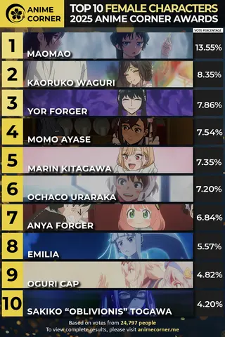 Согласно результатам открытого голосования премии Anime Awards, звание лучшей героини 2025 года досталось Маомао. Свои симпатии этой участнице «Монолога фармацевта» выразили более 24 тысяч зрителей.