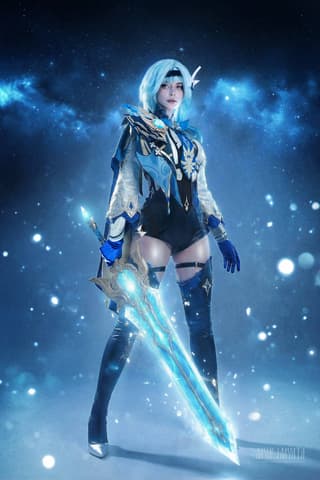 Eula serves as the Captain of the Knights of Favonius Reconnaissance Company. An elegant yet resolute combatant, she wields a heavy greatsword with a finesse that mirrors a sophisticated dance. Her Cryo abilities chill the air, leaving enemies immobilized in anticipation of her next lethal pirouette.